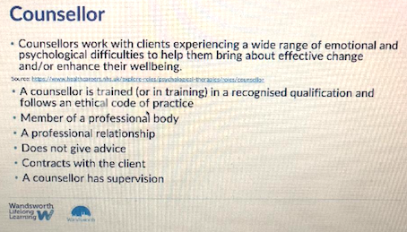 Jenny further commented: “It was difficult completing the course but it was certainly worthwhile and gave me a real insight into the world of counselling. The most single important lesson I learnt from this course was the importance of listening. When people are unwell then the last approach you should be taking is telling people what to do. You need to listen to what is said and what is not said and then offer supporting guidance so that individual can make an informed decision themselves.”