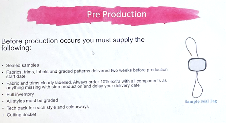 Participants learned how to build a strategic production plan and timeline, source materials efficiently, and manage suppliers. Claire emphasised the importance of accurate tech packs and specifications, explaining how clarity at this stage prevents costly errors later in the process.