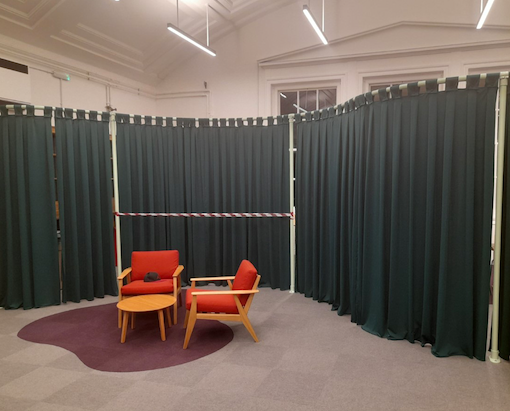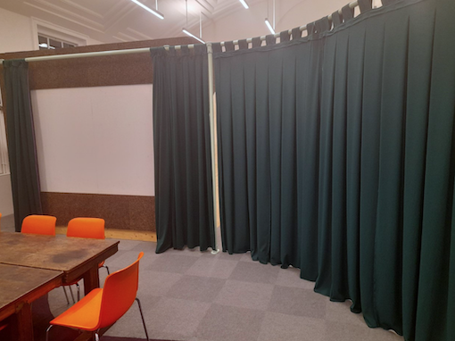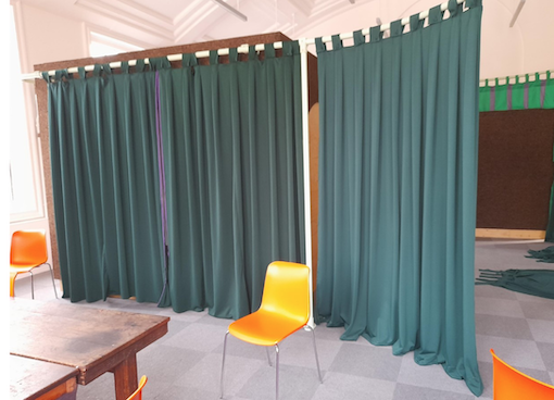 Back in the summer FC Designer Workspace undertook a free 3-day workshop in curtain making in collaboration with Public Works Group. This community led project saw the participants work through the entire process from; fully understanding the brief, working in small teams, measuring up, choosing the right fabric, designing and creating samples.