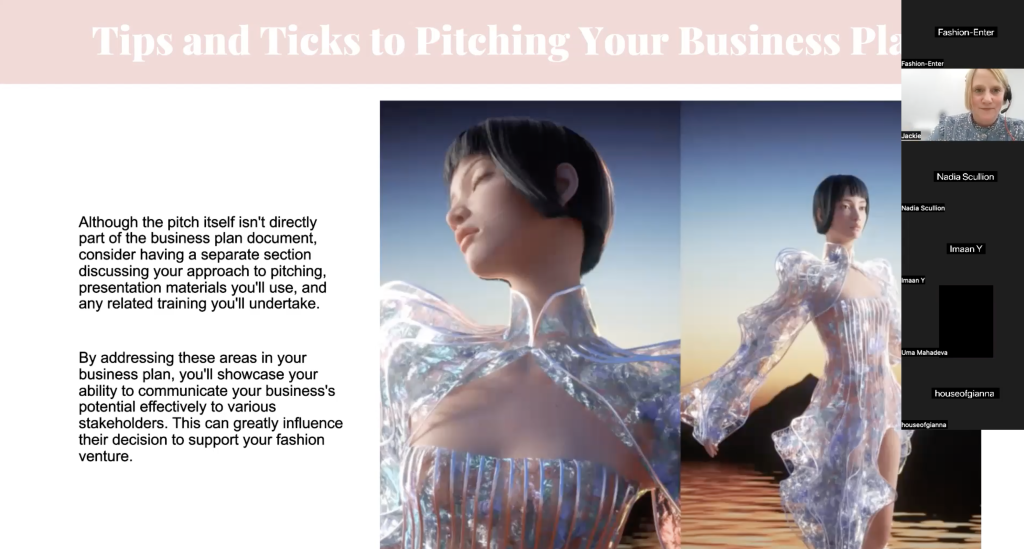 This morning’s free masterclass, 30th August, hosted via Zoom by FEL’s Deputy CEO Jackie Bertram, was open to the designers at the affordable Workspace on Durham Road and attracted 17 attendees. In this 1-hour masterclass, Jackie advised the upcoming designers on the most efficient ways on making a successful business plan.