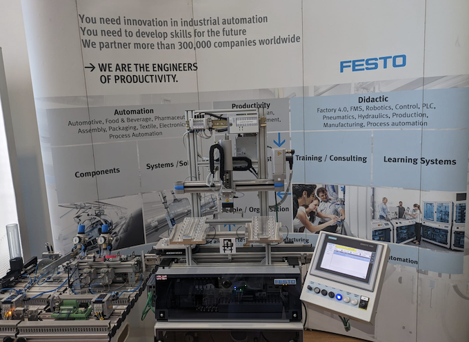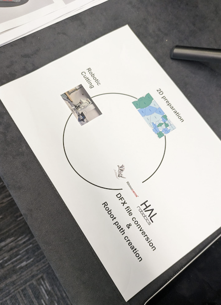 The Robotics living lab cutting arm live demonstration. Robotic arm on a gantry with cutting arm that can move up and down the table. (Does not take up much more space than a standard cutting table).