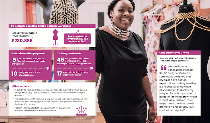 FEL has two operational workspaces with the programme. The FC Designer Collective shop on Fonthill Road which opened in 2019, and the FC Designer Workspace which launched September 2021. Since launching £230,886 has been generated in social value output. This has included 5 jobs created, 45 Islington residents receiving training, 10 local designers renting studio space and over 17 events to promote the space and the designers.